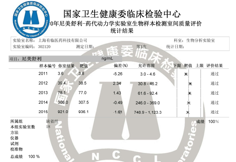 2020年4月底,国家卫生健康委临床检验中心公布了年前举办的药代动力学实验室室间质量评价结果,上海有临医药中心实验室再一次以满分成绩完美通过能力验证。迄今为止,有临医药的生物样品分析能力已多次获得国家权威机构认可。