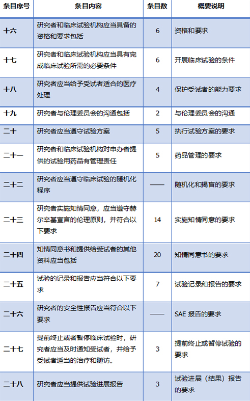 为了便于研究者在繁忙的工作中尽快检索到具体要求,笔者对有关研究者章节中的13条内容做了如下简表说明: