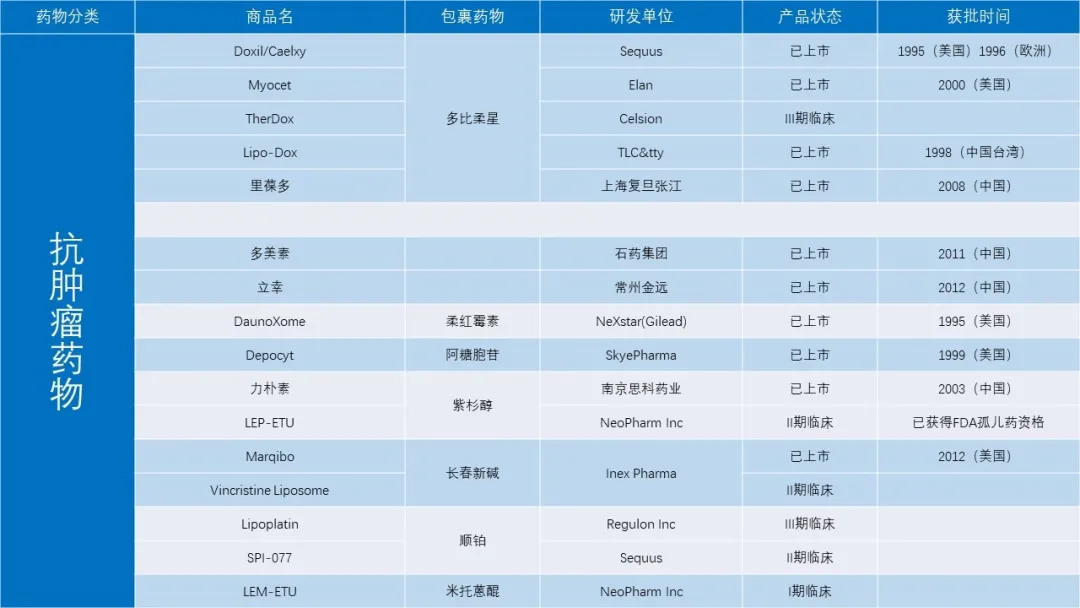 目前抗肿瘤领域,国内外脂质体药物已上市的有: