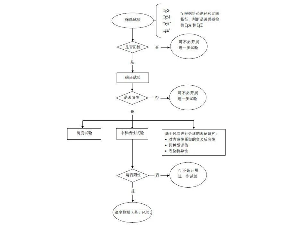 对于ADA的检测,NMPA、FDA、EMA均提倡分级评估的策略,首先对所有样品进行筛选试验,其次对阳性样品的特异性进行确证试验,对已确定的阳性样品进行滴度试验,以及通过功能性试验对抗体中和活性进行检测。其中在已确定的阳性样品中,还应考虑确定抗体同种型、亚型和结合表位的检测。NMPA、FDA、EMA对免疫原性多层级检测决策树基本一致,如下图所示: