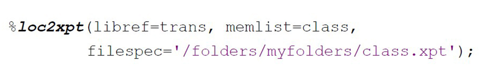 以下示例就是宏%LOC2XPT的调用,只需要一句代码就可以将数据集class. sas7bdat转成文件class.xpt。