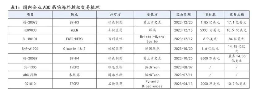安信证券统计,今年有约13起交易落地,交易前三靶点分别为Claudin18.2(6起),TROP2(3起),HER2(2起)。大多数交易的首付款在几千美元到2亿美元之间,百利天恒和BMS的双抗ADC授权合作以8亿美元首付款、84亿美元总交易额创造了新纪录。映恩生物是达成ADC授权交易最多的biotech,先后将ADC平台“DITAC”,DB-1303和DB-1311,DB-1305授权出去。