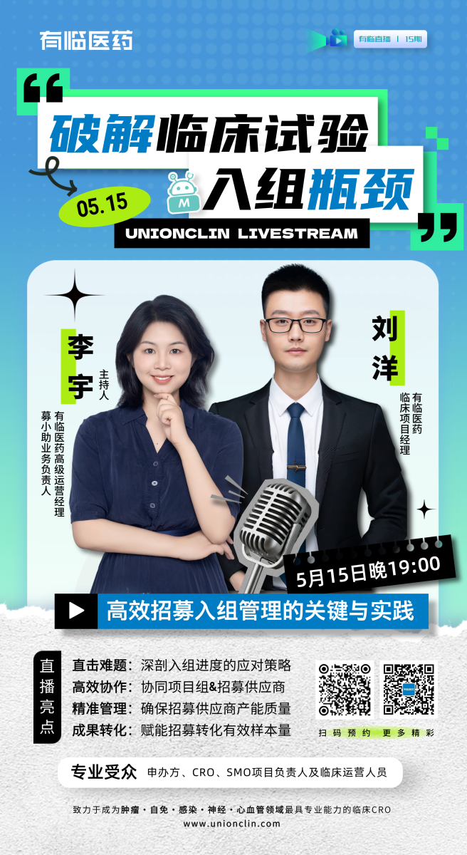 5月15日19:00,有临医药特别策划的行业深度对话即将开启,透过表象直击入组管理核心痛点,兼顾效率与合规的入组管理体系,为行业提供可落地的解决方案。