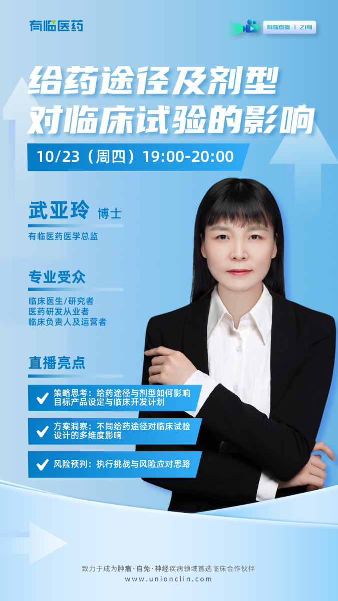 在新药临床试验中,药物的分子结构和作用靶点备受关注,而给药途径和剂型的选择同样至关重要,却易被忽视。10月23日,有临医药医学总监武亚玲博士进行专题分享,系统分析给药途径与剂型对临床试验各环节的深远影响,为业内同仁提供实践参考。