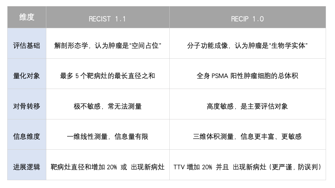 生物学深意:这一定义至关重要。一个在CT上清晰可见但PSMA PET阴性的新病灶,强烈暗示了PSMA阴性克隆的出现。这是在治疗压力下,肿瘤细胞通过克隆演化产生的耐药亚群。RECIP 1.0通过将此纳入评估,实现了对耐药性进展的早期预警。