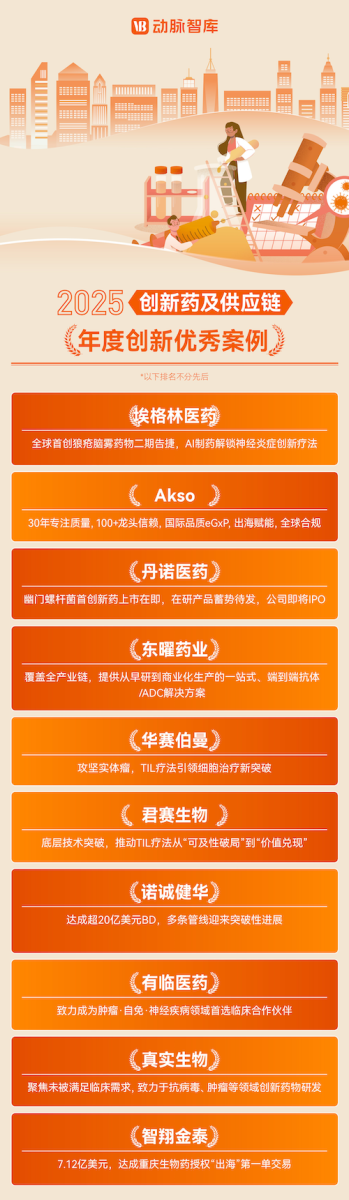 在创新药行业加速分化、价值回归的2025年,中国医疗健康生态的前沿观察者与深度参与者——动脉网,于2025年12月29日正式发布《2025创新药及供应链年度创新白皮书》。白皮书深刻指出,当前产业正经历从“故事”到“实力”、从“速度”到“质量”的核心逻辑变化,一个聚焦产品力、平台力与全球服务能力的新时代已然来临。在此背景下,系统性识别与推介真正具备价值的创新实践,对于指引产业方向至关重要。