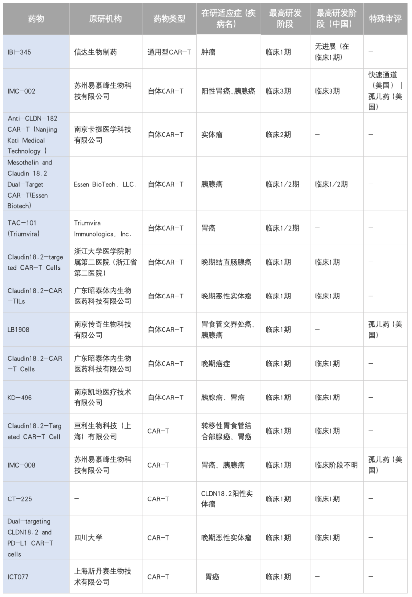 除CT041外,国内其他企业也在积极布局,例如苏州易慕峰生物的IMC-002也已进入III期临床,南京传奇生物的LB1908等处于早期阶段,具体见下表。