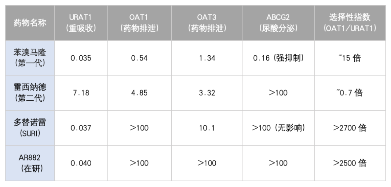 不仅要关注对URAT1的半抑制浓度(IC50),更要评估其对相关转运体的选择性倍数。
