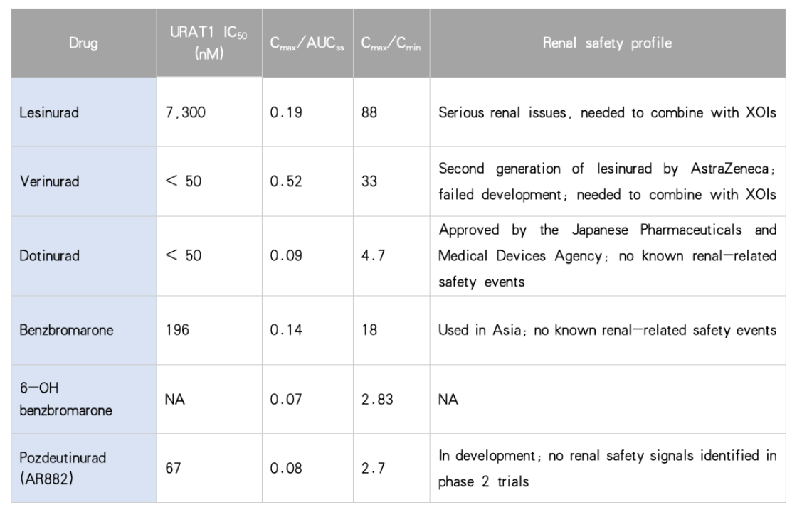 临床审评的核心也已从单纯的疗效考核,演变为对分子选择性、药代动力学特性、深层组织疗效以及长期安全性的系统性评估。一款成功的URAT1抑制剂,必须在效力、选择性、安全性以及患者用药便利性之间取得最佳平衡。