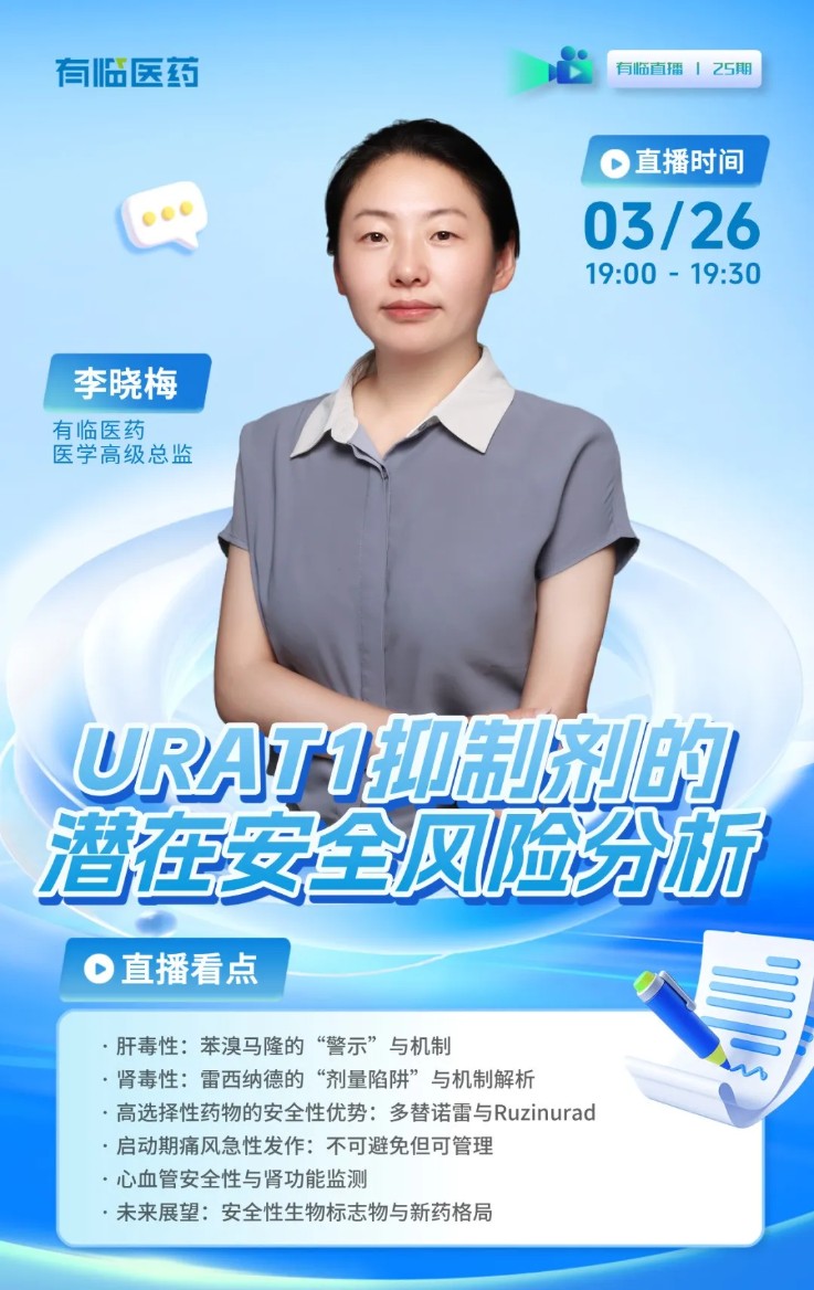 日前,有临医药医学高级总监李晓梅博士围绕“URAT1抑制剂的潜在安全风险分析”主题,系统梳理了痛风药物研发的安全性挑战与新药突破。本次直播深入解析了URAT1靶点机制、不同药物的肝肾毒性差异及未来研发趋势,为临床研究与药物开发提供了重要参考。