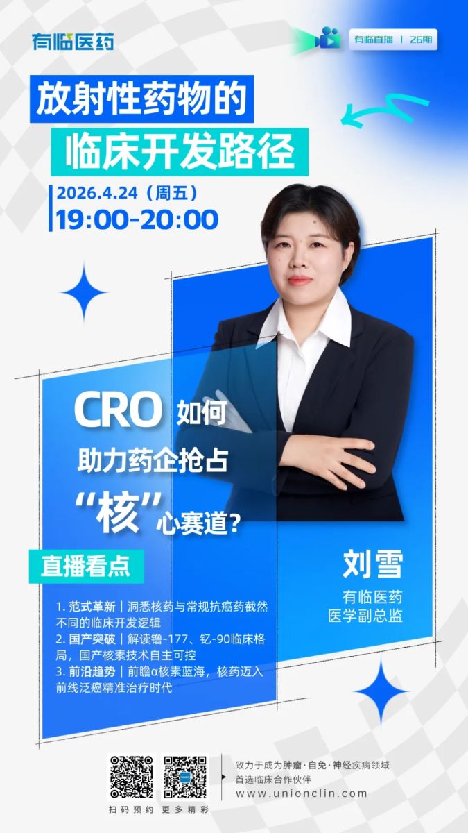 从镥-177到α核素,从PSMA到泛癌靶点,"诊疗一体化"正重构肿瘤治疗逻辑。4月24日19:00,有临医药医学副总监刘雪女士,带您读懂放射性药物临床开发的独特哲学与范式跃迁。