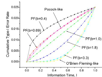 自适应设计需要在试验中途看一下数据更新情况与可调元素相关的信息,中期分析常是自适应设计的重要一环,特别在时间长的确认性试验中。到哪个结点(多少例病人,发生多少次关注事件)进行中期分析,要做几次中期分析,均需在设计中明确。中期分析分为揭盲与不揭盲。不揭盲的话,只对主要终点数值合起来重算variance,算得新的variance后再重新估算样本量。这种中期分析不揭盲,不做统计推论,也无所谓统计学惩罚,或常说的alpha折损或调整。但如果要揭盲,对终点在中期分析时就做统计推论,那就要依据一定的规则或alpha调整函数(alpha spending function)来调alpha。见下图:Pock-like,O’Brien-Flemiing-like 是两种调节alpha的代表,其他是Alpha spending函数(PF)在不同设设置(b=0.4,0.69,…, 1.0,1.8,3.3)情境下的图示。