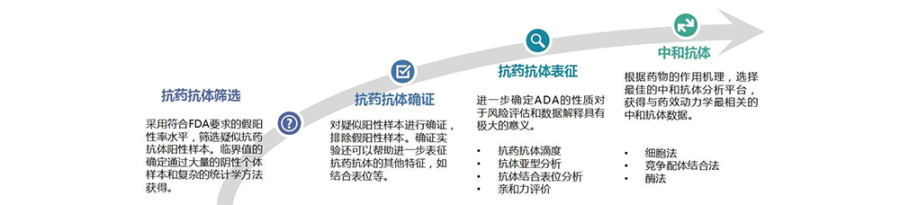 抗药抗体的检测可以使用多种生物分析平台来完成,包括ELISA( Enzyme-linked immunosorbent assay)、ECL(Electrochemiluminescence)、RIA(Radioimmunoassay)、 SPR(Surface plasmon resonance)。