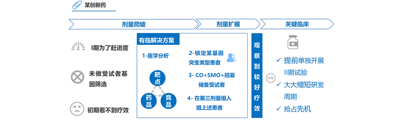 在某个项目中,爬坡2个剂量组后仍看不到疗效,到底是因为剂量不够没有产生疗效,还是因为没有找到合适的生物标志物导致的入组全人群,所以看不到疗效?有临医学通过靶点、药品及同类药物分析,找到了可能有用的生物标志物,建议修订方案,改成入组某基因突变的受试者。运营及患者招募板块,做好该基因突变受试者的患者招募和储备,在预估可能会起效的第3剂量组,入组了该基因突变的受试者,很快观察到有受试者肿瘤部分缓解。有了这个合适的生物标志物,后续的适应症选择也水到渠成。