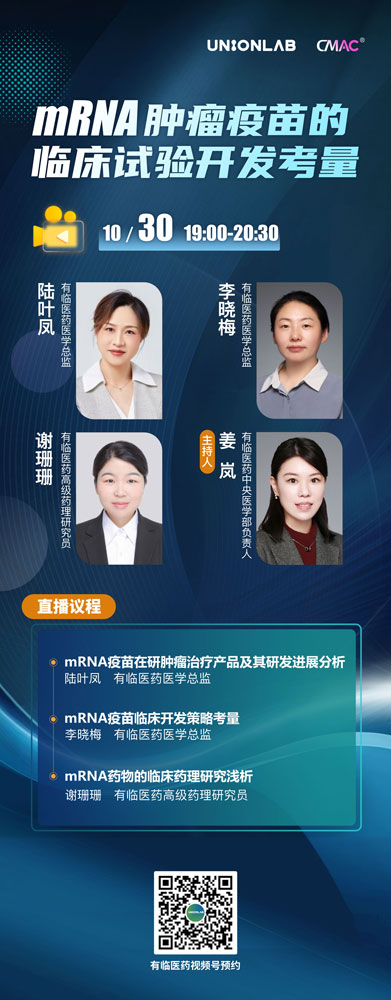 10月30(周一)晚19:00-20:30, 有临医药携手CMAC推出《mRNA肿瘤疫苗的临床试验开发考量》直播,由有临医药中央医学部负责人姜岚女士主持,特邀有临医药医学总监陆叶凤、有临医药医学总监李晓梅及有临医药高级药理研究员谢珊珊就这一时下热点话题展开以下内容的讨论: