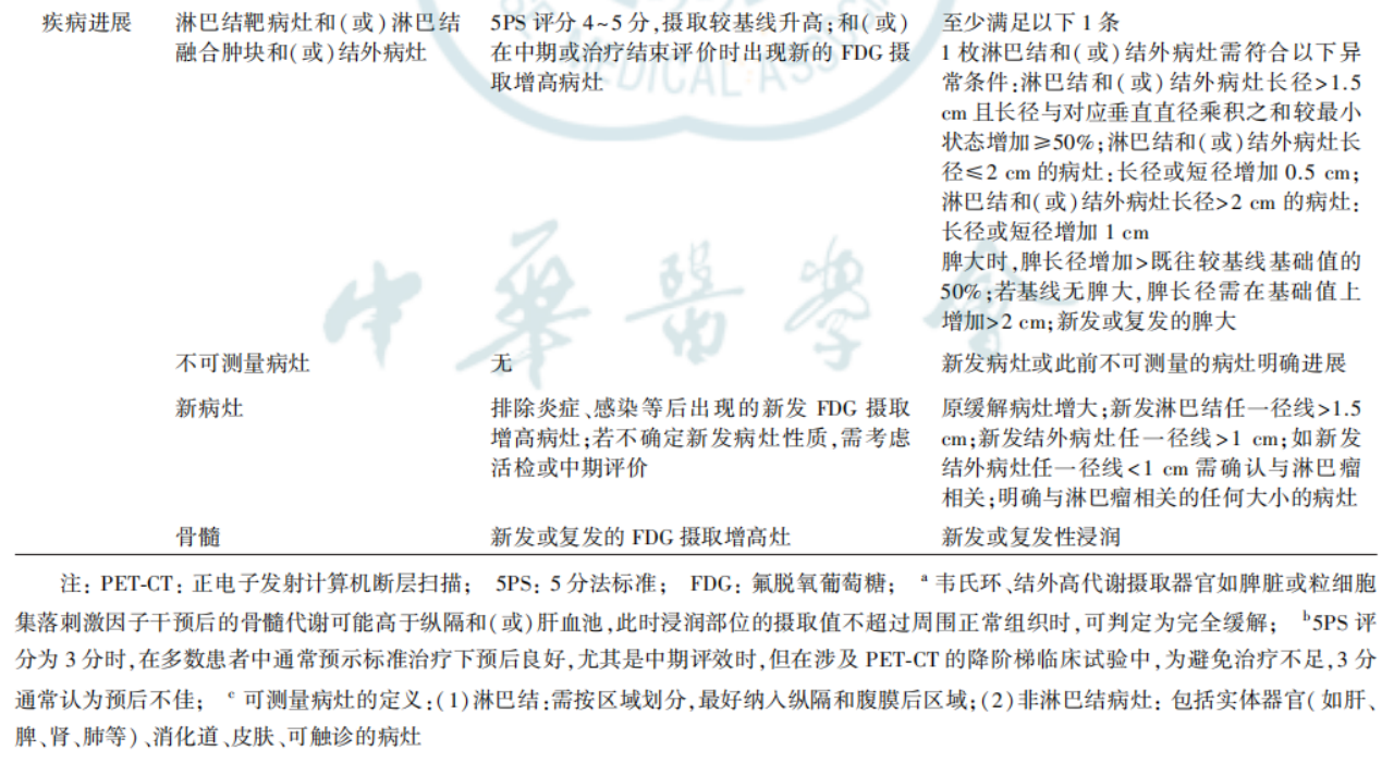 Lugano是关于霍奇金淋巴瘤(HL)和非霍奇金淋巴瘤(NHL)的初始评估、分期以及治疗反应评估的指南。淋巴瘤治疗的疗效评估分为影像学缓解(CT/MRI 评效)和代谢缓解(PET/CT 评效),将FDG-PET与CT/MRI结合使用,作为FDG亲和性淋巴瘤的标准分期工具。使用5PS评分系统评估FDG亲和性组织学的治疗反应。
