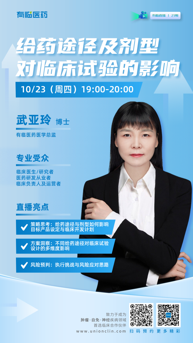 10月23日(周四)19:00,有临医药医学总监武亚玲博士,将为您带来深度分享《给药途径及剂型对临床试验的影响》。敬请锁定有临直播间,让我们从精准给药选择开始,提升临床开发效率与成功率。