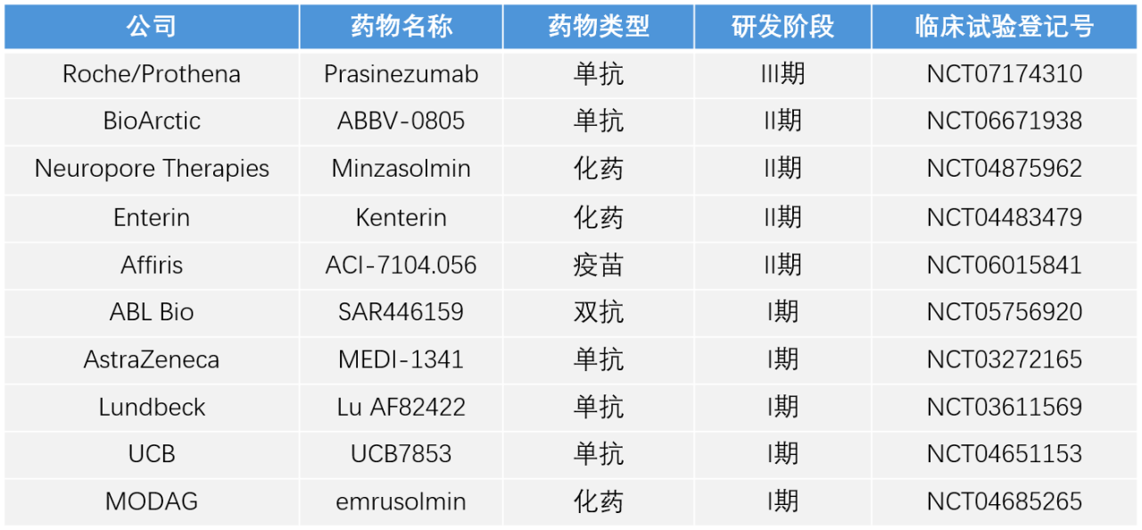 - α-突触核蛋白是一种在中枢神经系统中广泛分布的突触前蛋白,是PD病理标志物路易小体的主要组成成分。为寻找PD的疾病修饰疗法,正在探索多种直接或间接针对α-突触核蛋白聚集的方法。目前进展最快的是Annovis Bio制药公司的Buntanetap口服小分子药物,已完成III期临床试验,研究结果表明其在改善运动和非运动症状以及早期PD患者的认知功能方面是安全有效的,其有可能成为靶向α-突触核蛋白第一个上市的药物。除小分子药物外,靶向α-突触核蛋白的还有单抗、双抗大分子药物及疫苗等也在临床研发阶段,详见表1。