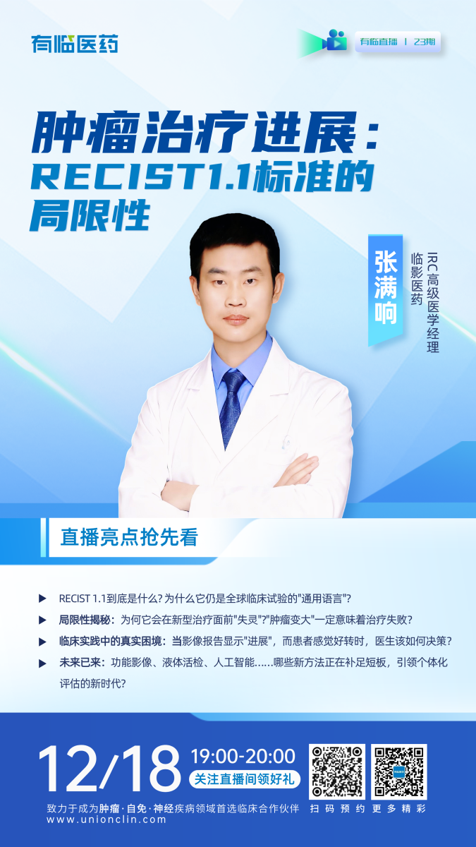 12月18日(周四)19:00,临影医药IRC高级医学经理张满响将带领我们直面肿瘤疗效评估的核心挑战,解读RECIST 1.1标准在当前治疗格局下的局限与对策。