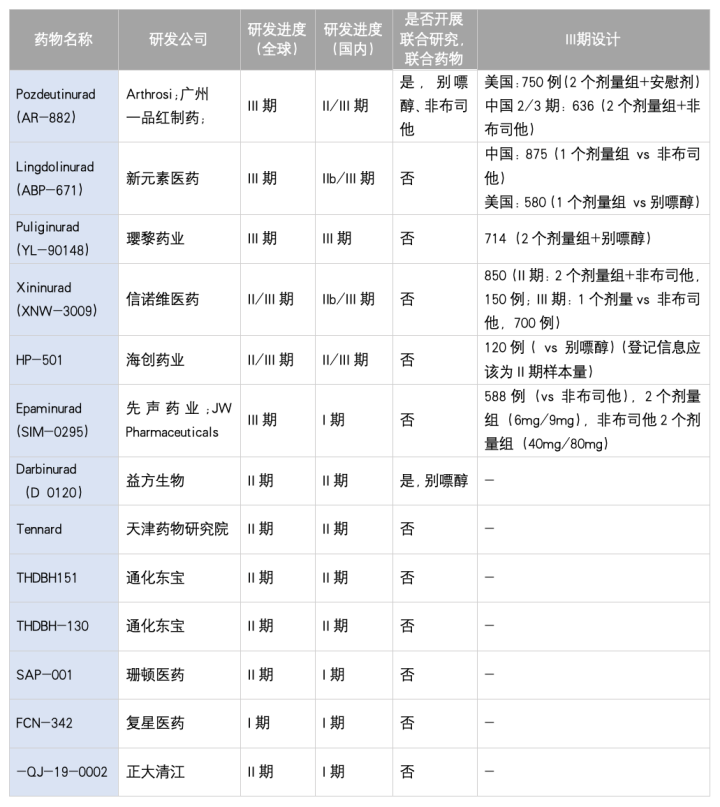 表 3 中国URAT1抑制剂临床研究开展情况
