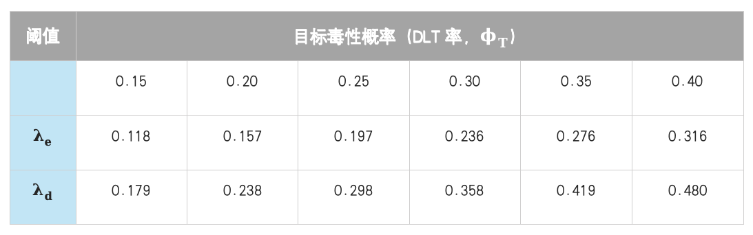 不同于传统设计的死板,BOIN设计的核心在于“最优区间”概念。其思路非常直观:通过最小化将受试者分配至不恰当剂量(过高或过低)的概率,来确定决策边界。简单来说,它设定了两个阈值(λe和λd),将DLT发生率划分为三个区域(如表1):