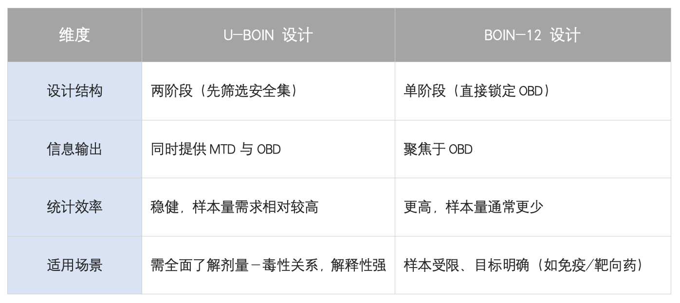 BOIN-12与U-BOIN虽然核心目标一致——均为精准定位最优生物剂量(OBD),但路径选择截然不同。