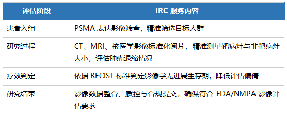 提供 PSMA 患者筛查、病灶精准测量、依据 RECIST 标准的疗效终点判定、影像数据质控、申报合规等全流程IRC 独立影像评估服务。